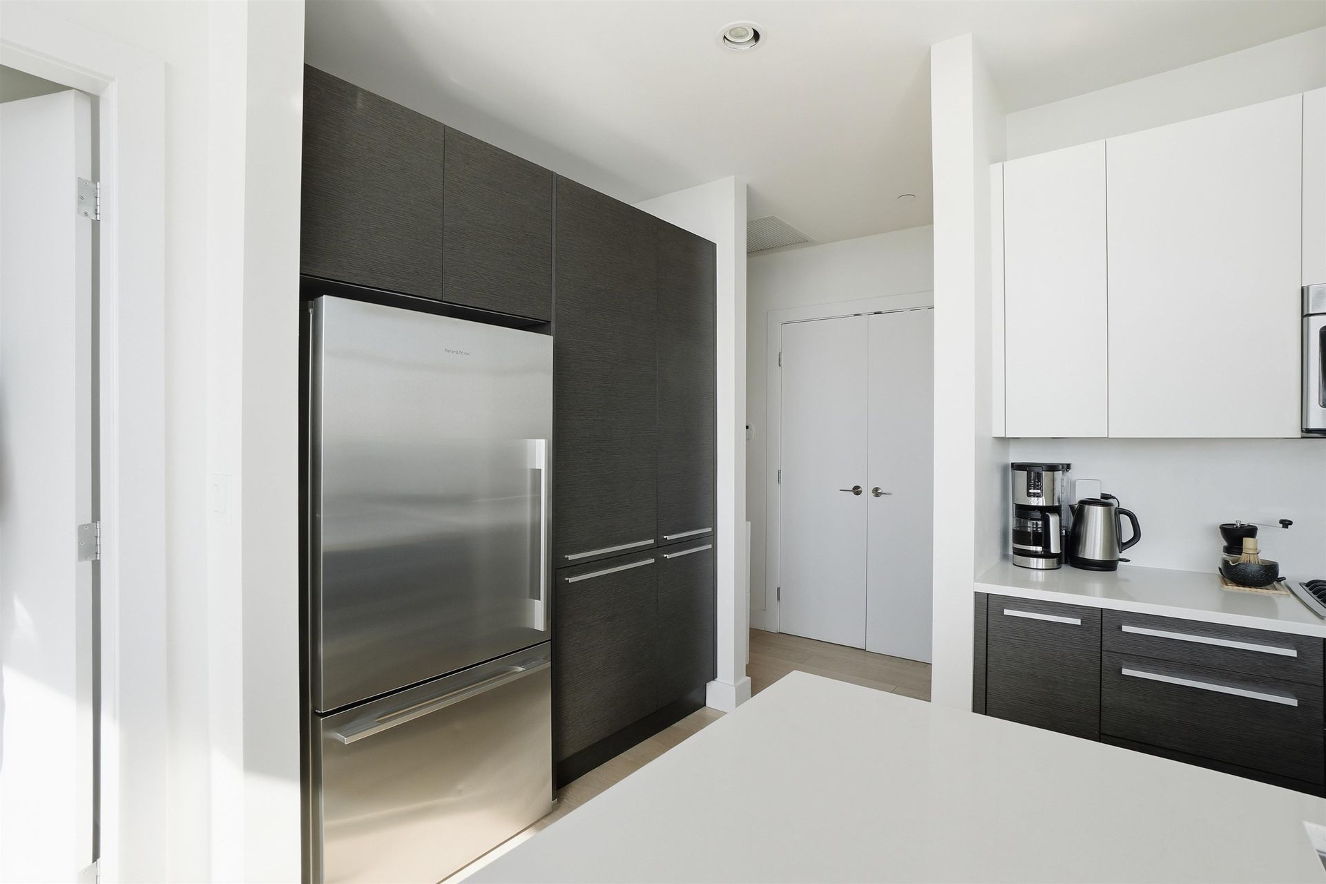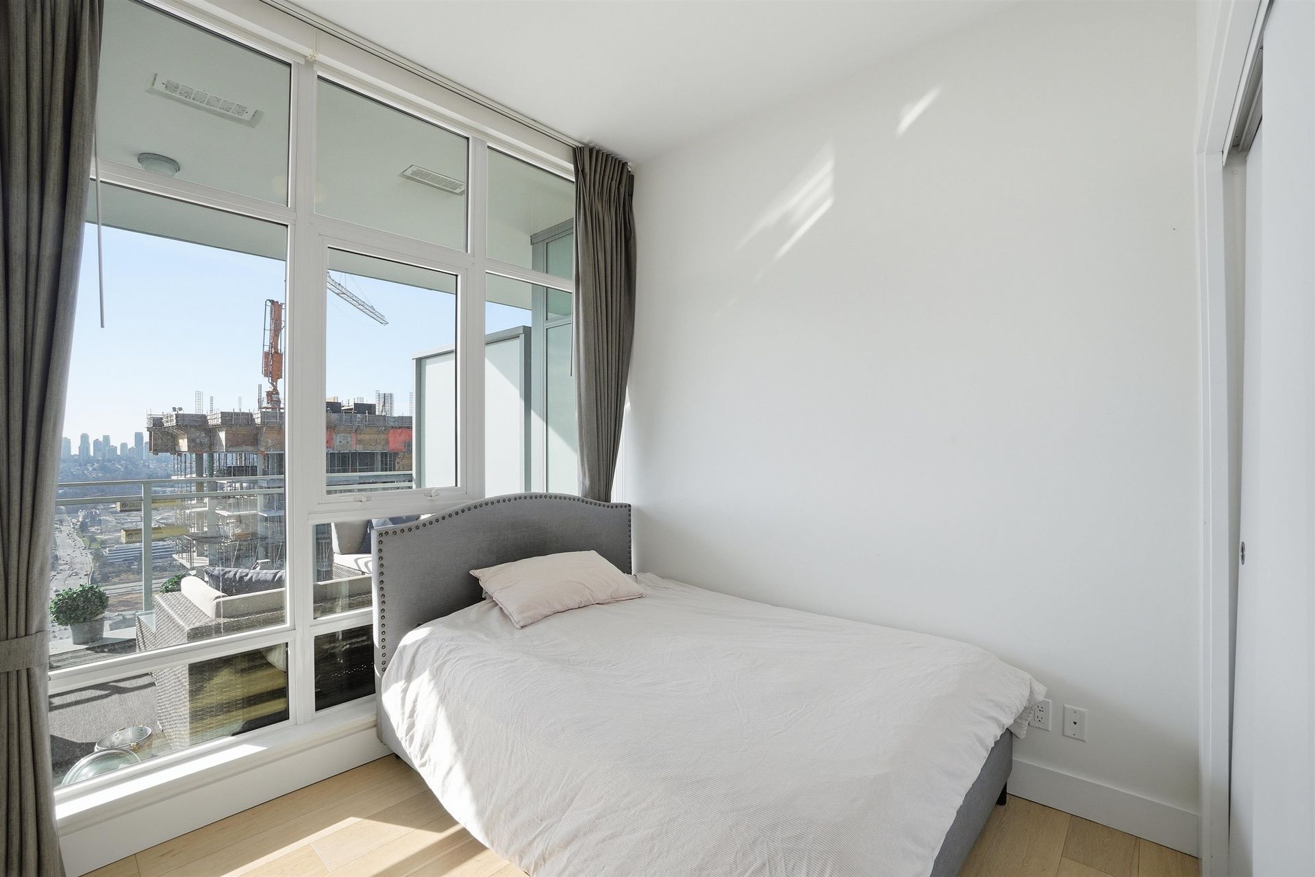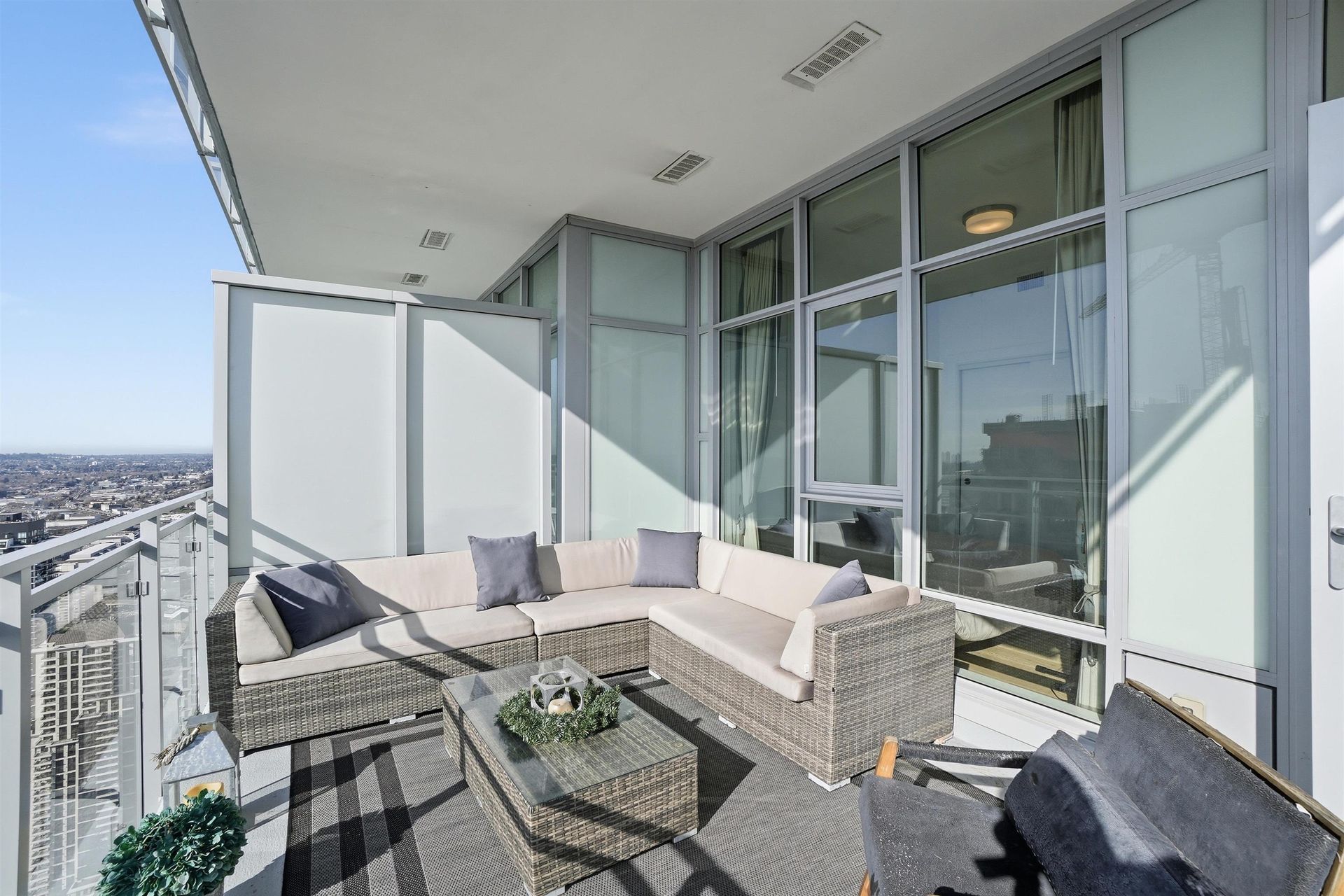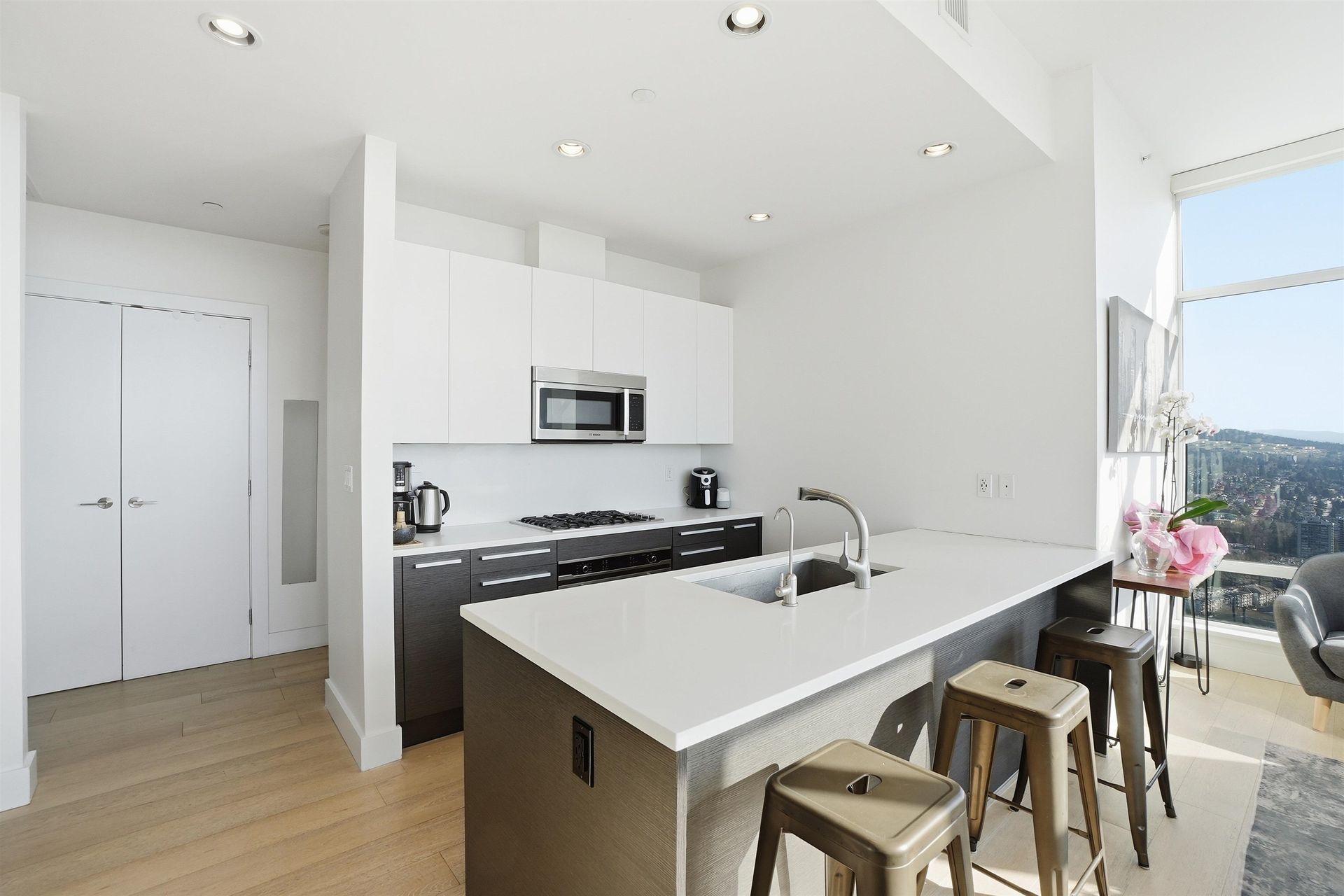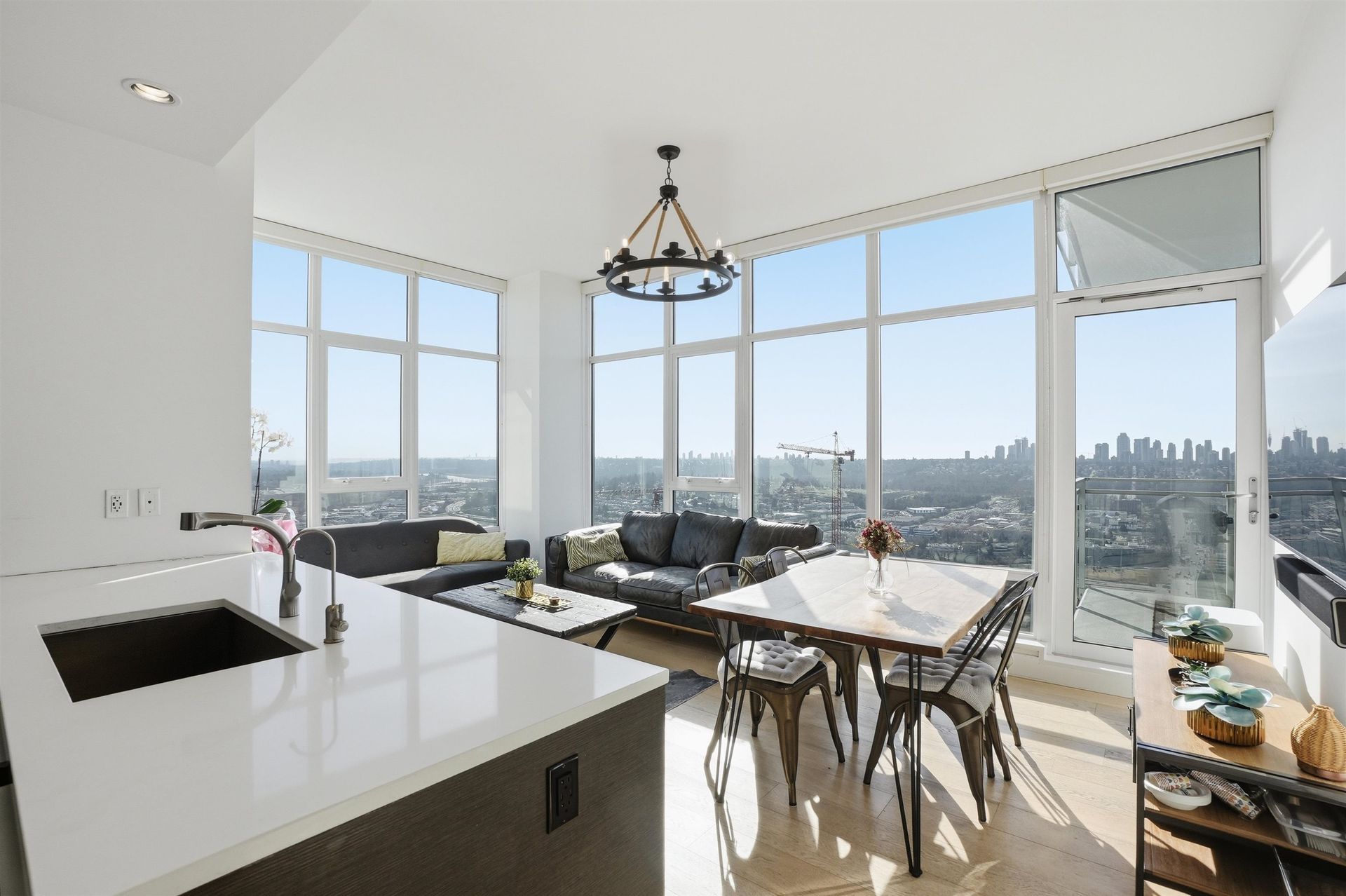 Stunning sub-penthouse corner residence at Bosa's Solo District. This bright 3-bedroom, 2-bath home offers over 1,045 sq ft of thoughtfully designed living with impressive 10-foot ceilings and expansive floor-to-ceiling windows framing sweeping unobstructed panoramic views. The open kitchen, living and dining areas create an inviting space for everyday living and entertaining, while two large balconies extend the living space outdoors. Comfort is ensured year-round with geothermal heating and air conditioning. Thoughtful upgrades include blackout blinds and California Closets. Includes the rare convenience of 2 parking stalls and 2 storage lockers. Exceptional amenities include fitness centre, basketball court, rooftop deck and lounge. Steps to Brentwood SkyTrain, shopping and dining.